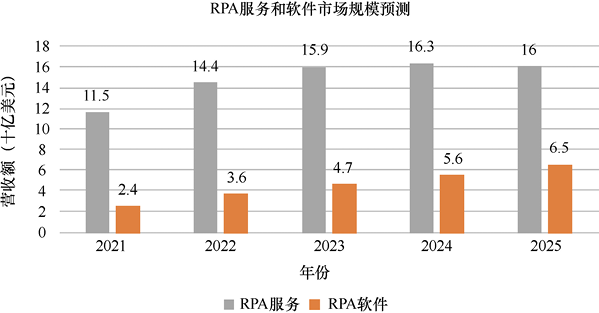 经过多年的发展,RPA行业已经成为拥有20亿美元(1美元约7.25元人民币)市场的快速增长行业。HFS的数据显示,RPA行业的年增长平均速度超过50%,预计2023年全球市场规模将达到103亿美元,截至2019年,中国RPA市场规模为10.2亿元,较上年增长96.6%。2020年受疫情影响增速有所下滑。但全球著名咨询调查机构Forrester发布的RPA市场调查报告显示,到2025年,全球RPA市场规模将达到225亿美元,其中,RPA服务市场规模为160亿美元,RPA软件市场规模为65亿美元,RPA服务市场规模几乎是软件市场规模的3倍,如图1-5所示。