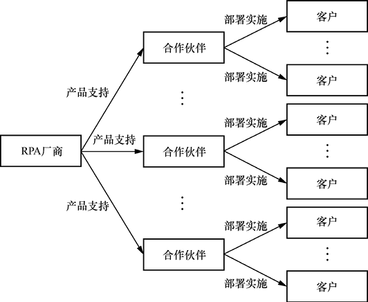 一般来说,本地化部署模式大多由RPA厂商提供产品和技术支持,并由其合作伙伴提供流程挖掘、流程定制化开发和售后维保等服务(也有部分RPA厂商提供原厂交付),而用户作为RPA的最终使用者将从RPA实施后的效率提高上获得应有的价值。