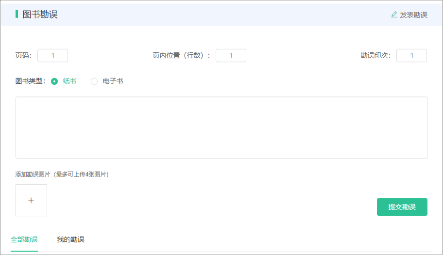 当您发现错误时,请登录异步社区(https://www.epubit.com/),按书名搜索,进入本书页面,单击“发表勘误”,输入错误信息,单击“提交勘误”按钮即可(见下图)。本书的作者和编辑会对您提交的错误进行审核,确认并接受后,您将获赠异步社区的100积分。积分可用于在异步社区兑换优惠券、样书或奖品。