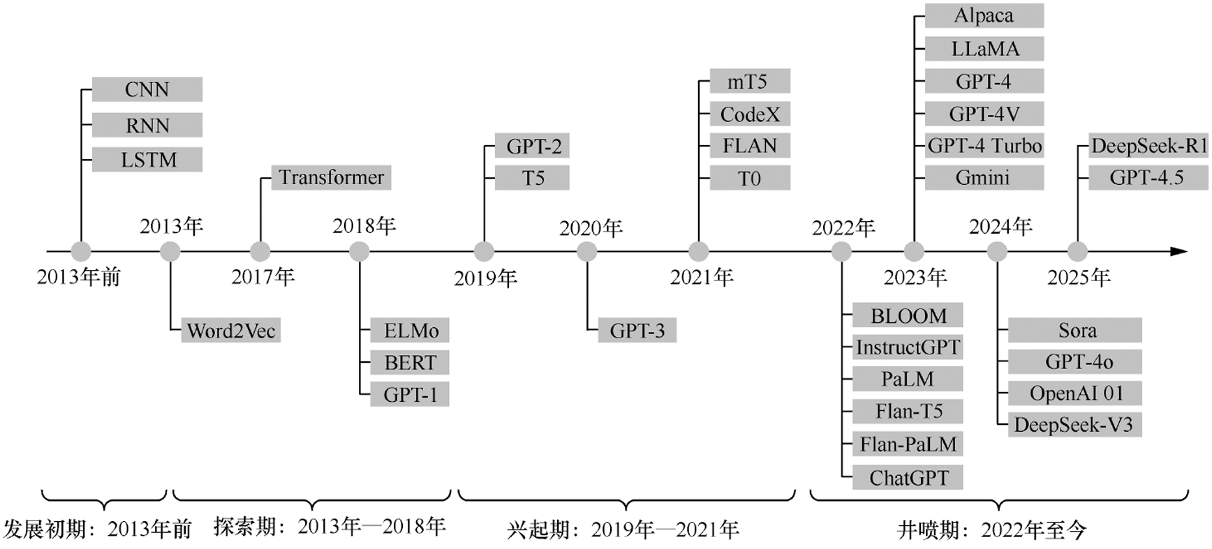 大模型技术过程如图1-1所示。在大模型技术发展初期,人们在解决具有序列特性的数据(指具有先后顺序的数据)的领域的问题时,主要依赖RNN(Recurrent Neural Network,循环神经网络)[2]和LSTM(Long Short-Term Memory,长短期记忆网络)[3]等序列模型,但这些模型都包含不可并行计算的缺点。