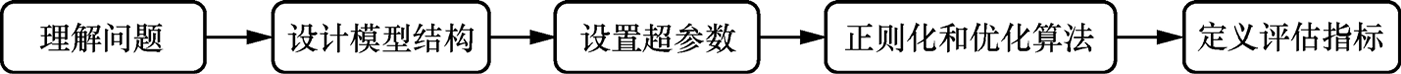 如图1-11所示,模型设计过程一般包含 5 个步骤。在充分理解问题后,开发者需要选择合适的模型结构,设置学习率(学习率决定了模型在每次迭代时,根据损失函数的梯度对权重进行更新的幅度)、批次大小和迭代次数等超参数,通过正则化(如 L1/L2正则化、Dropout等,正则化用来降低模型的复杂度,防止过拟合)提高模型的泛化能力,并通过优化算法(如SGD优化器、Adam优化器等)调整学习率。对于模型效果的优劣,可以通过定义合理的评估指标来确定。常用的评估指标包括Accuracy(精度)、Precision(查准率)、Recall(查全率)、F1分数、均方误差等。