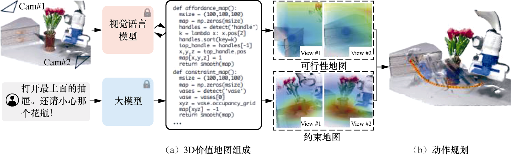 如图1-13所示,斯坦福大学的李飞飞团队发布的VoxPoser系统将大模型接入机器人,并将人类指令转化为对机器人具体的行动规划,获得了优异的零样本学习能力,能够实现生活场景的避障操作[60]。