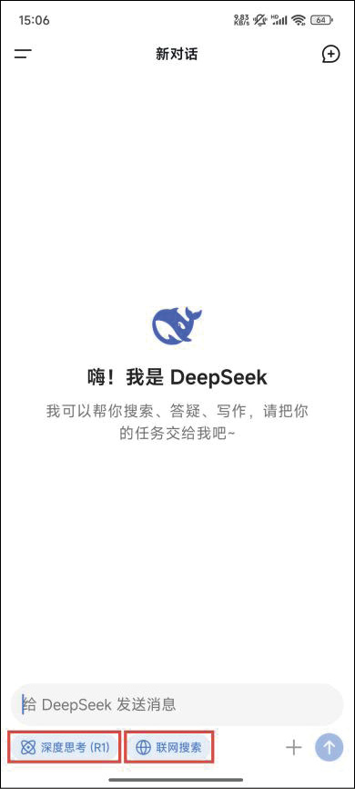 打开DeepSeek手机版并登录,界面底部有“深度思考(R1)”按钮和“联网搜索”按钮,如图1-1-1所示。