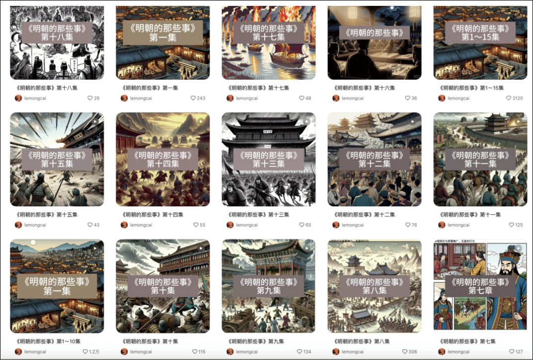 在国内的短视频创作领域,一位才华横溢的博主独辟蹊径,将畅销历史读物《明朝那些事儿》精心改编为系列短视频,如图1-4-2所示。博主深入研读原著,精准提炼其中跌宕起伏的历史事件、性格鲜明的人物形象,以生动有趣的动画形式呈现,配上简洁易懂且幽默风趣的旁白解说,把明朝近三百年的风云变幻栩栩如生地展现在观众眼前。