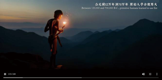 2023年9月7日,以AI与大模型为核心的上海外滩大会盛大启幕。在这场备受瞩目的科技盛会中,蚂蚁集团重磅发布蚂蚁金融大模型,正式向外界揭开其神秘面纱。作为大会开场的视频“点亮”,宛如一台时光放映机,凭借AI技术,栩栩如生地呈现创世以来人类科技变革的宏大历史长卷。从远古时期钻木取火的智慧萌芽,到工业革命中机器的轰鸣运转,再到信息时代互联网的飞速发展,每一次科技的重大突破,都如同在黑暗中点亮一盏明灯,为下一次变革孕育无限可能,也为人类文明的进步铺就坚实的基石。视频画面如图1-5-1~图1-5-4所示。