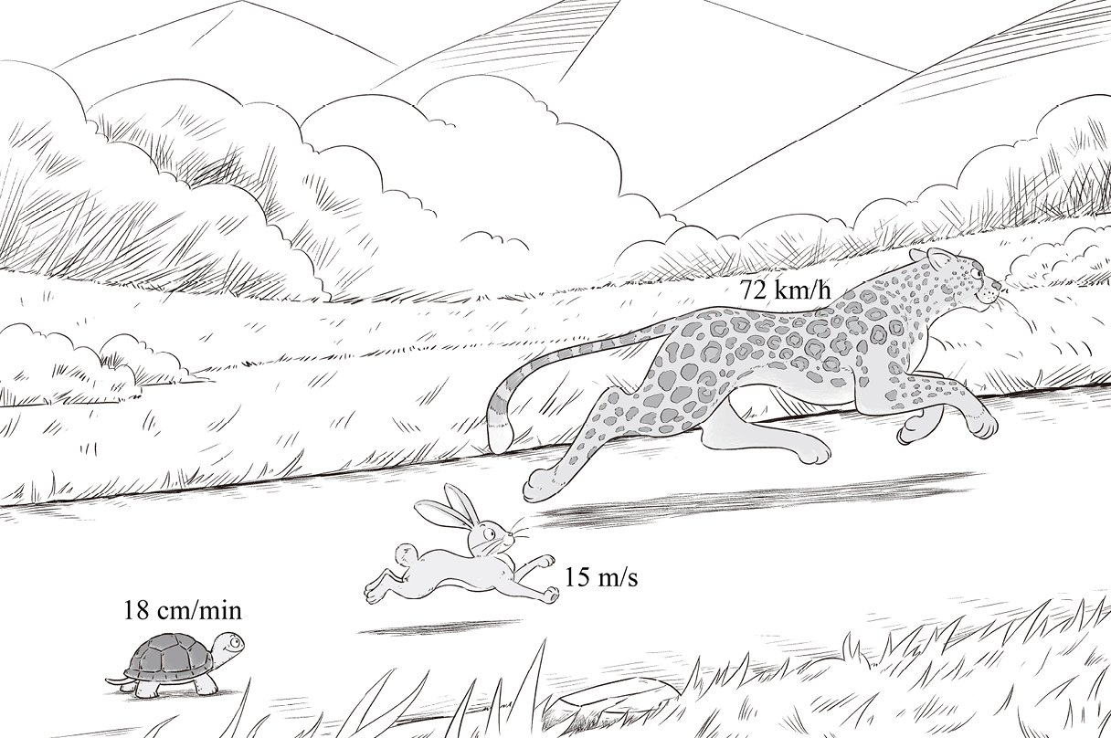 现在假定你想比较 3 个动物的运动速度,A 为18 cm/min,B为15 m/s,C为72 km/h,那么谁最快呢?这个问题不是一眼就可以看清楚的,要回答就得先转化单位,将这3个速度变成同一单位再比较。