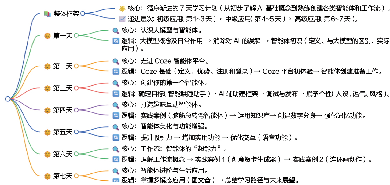 本书采用循序渐进的7天学习计划,系统性地引导读者实现从初步了解AI基础概念到熟练创建各类智能体和工作流的转变。其学习框架如下图所示。