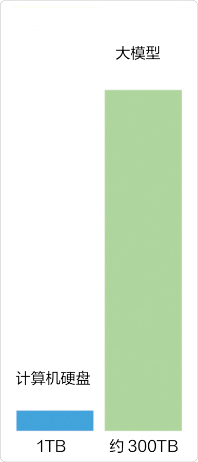 二是它所需的存储空间非常大。我们的计算机硬盘也许有1TB(1024GB)的存储空间,可大模型动辄需要几百TB甚至更大的存储空间,使用几百个甚至上千个这样的计算机硬盘才能存储一个大模型!计算机硬盘的存储空间和大模型所需的存储空间对比如图1-1所示。