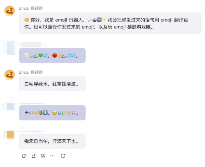 Coze的娱乐智能体“Emoji 翻译器”能帮助你将一个仅包含Emoji的谜语,解码成文字。小王最近在网上经常看到“根据Emoji猜古诗”的活动,于是他将谜语输入给“Emoji翻译器”后,翻译器顺利解码出了正确诗句,如图2-11所示。