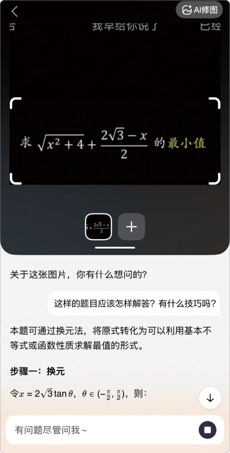 你是否会解答数学题或者对物理概念的理解模糊?让大模型帮你攻克难关。小红在解答一道有关函数最值的数学题时遇到了困难,她通过向文心一言提问,获得了清晰的答题步骤,如图1-3所示。认真分析这些步骤后,她立刻就明白了应该怎样解答。
