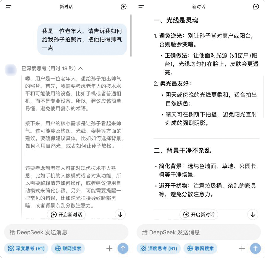 你是否想知道如何去除衣服上的顽固污渍或者如何制作一道特色菜?对于这些问题,大模型都能给你提供详细的解决步骤。李大爷用DeepSeek学会了如何用手机拍出好看的照片,如图1-5所示。他拍摄的孙子的照片特别清晰、好看。