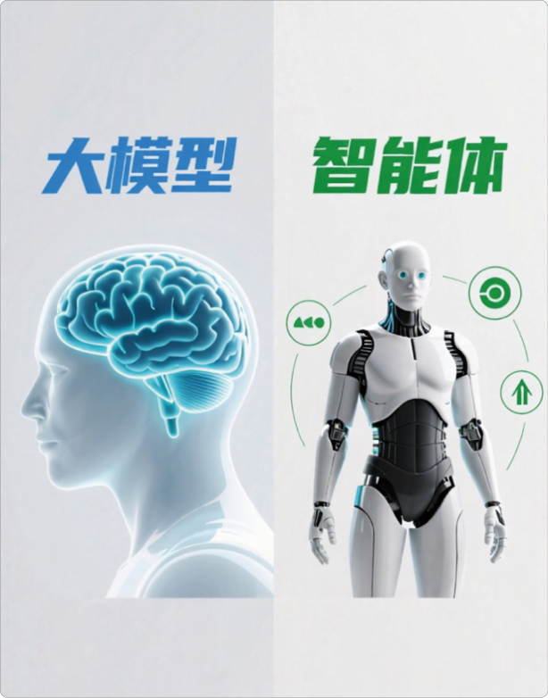 智能体听起来很高级,其实就是一种能够感知环境并采取行动的AI助手。简单来说,如果把大模型比作一个超级聪明的大脑,那么智能体就是给这个大脑装上了眼睛、耳朵和手脚,让它能看、能听、能做事,两者的直观对比如图2-1所示。