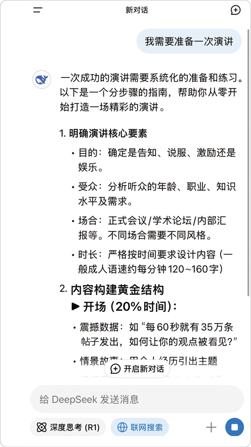 再举个例子,假如你告诉DeepSeek:“我需要准备一次演讲”。它可能会给你一些演讲的通用建议和模板,如图2-4所示。