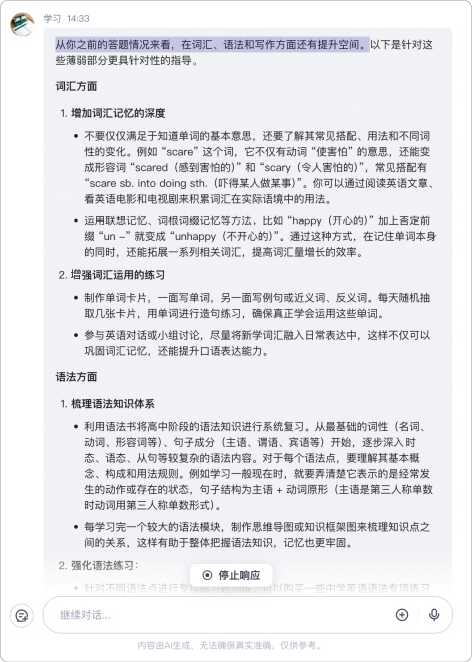 教学智能体“学习”不仅能回答你的问题,还能根据你的学习进度和薄弱部分,为你定制个性化的学习计划。例如,在小明学习英语时,“学习”发现他在词汇、语法和写作方面还有提升空间,就会推荐更多练习材料,并定期测试他的学习效果。它还会教小明如何制作单词卡、如何梳理语法知识体系,确保知识不会被遗忘,如图2-7所示。