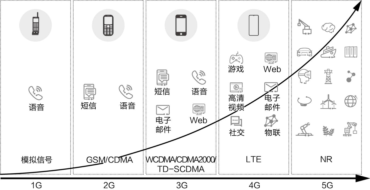 注:GSM为Global System for Mobile Communications,全球移动通信系统;CDMA为Code Division Multiple Access,码分多址;WCDMA为Wideband Code Division Multiple Access,宽带码分多址;TD-SCDMA为Time Division-Synchronous Code Division Multiple Access,时分同步码分多址;LTE为Long Term Evolution,长期演进技术;NR为New Radio,新空口。