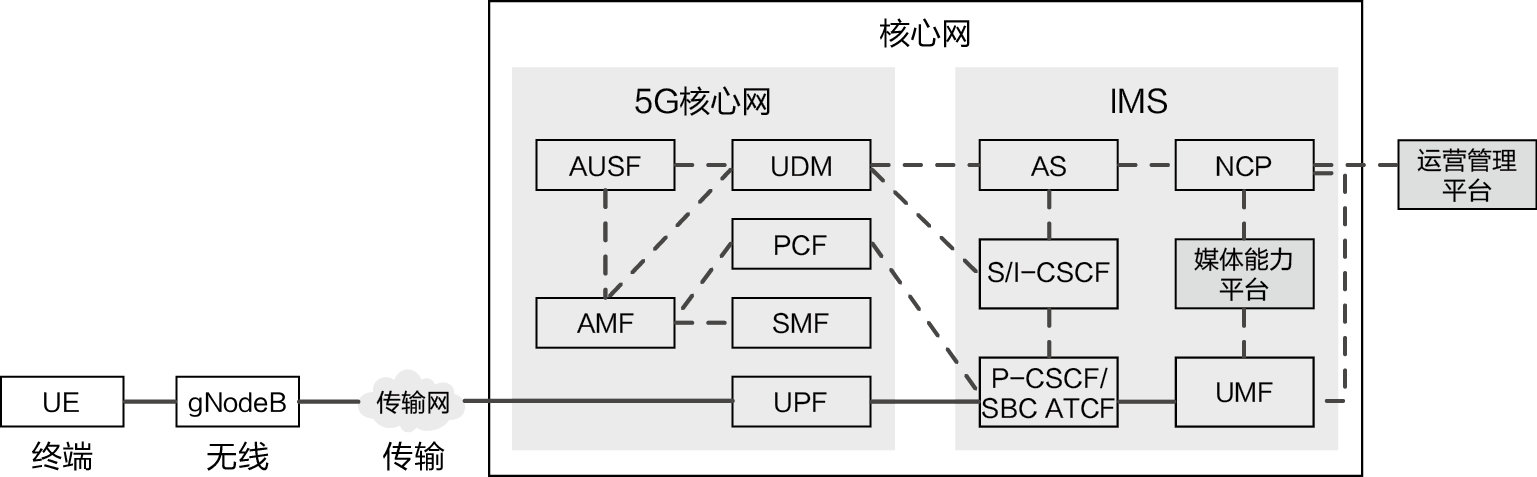 IMS域提供IP多媒体服务的标准化架构框架,包括CSCF(Call Session Control Function,呼叫会话控制功能)、MGCF、MRFC和MRFP。CSCF主要实现注册、鉴权、会话控制、业务触发、拓扑隐藏、QoS控制、NAT(Network Address Translation,网络地址转换)穿透、安全管理等功能;MGCF使IMS用户和CS用户之间可以实现通信;MRFC根据来自AS(Application Service,应用服务)和S-CSCF的信息操控MRFP,使MRFP提供用户面资源,完成输入媒体流的混合和处理等。