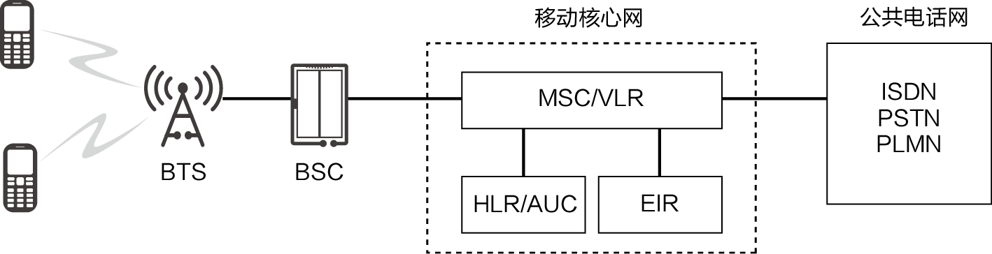 注:BTS为Base Transceiver Station,基站收发台;BSC为Base Station Controller,基站控制器;MSC为Mobile Switching Center,移动交换中心;VLR为Visitor Location Register,漫游位置寄存器;HLR为Home Location Register,归属位置寄存器;AUC为Authentication Center,鉴权中心;EIR为Equipment Identity Register,设备识别寄存器;ISDN为Integrated Service Digital Network,综合业务数字网;PSTN为Public Switched Telephone Network,公用电话交换网;PLMN为Public Land Mobile Network,公共陆地移动网。