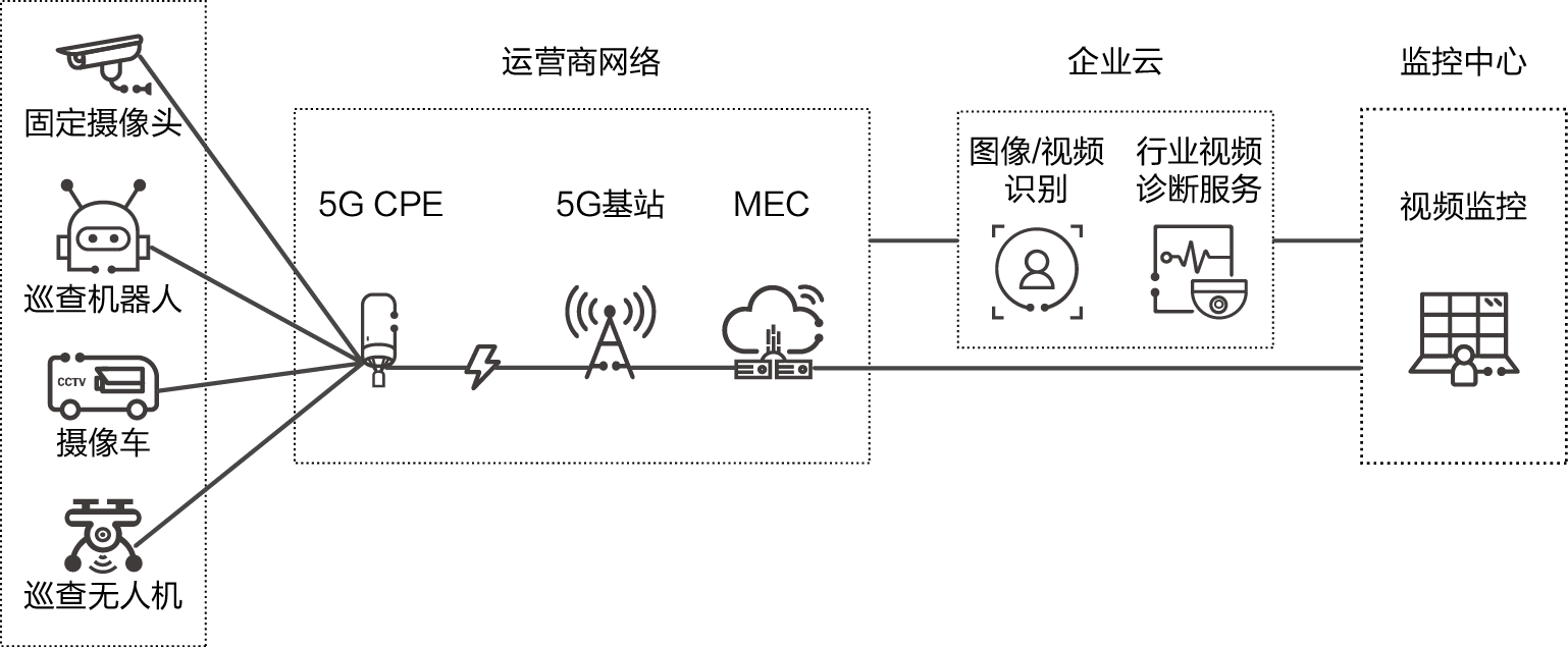 第一类是视频监控类、现场作业类业务。该类业务主要用于园区/厂区内安防监控、移动巡检、业务检测等领域,主要涉及上行流媒体回传,要求有较大上行带宽。回传后的视频流数据可以本地存储或者进行实时在线的后端分析处理。