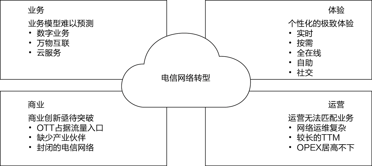 NFV技术通过软硬件解耦及功能抽象,使网络设备功能不再依赖于专有硬件,资源可以实现充分、灵活共享,实现新业务的快速开发和部署,并基于实际业务需求进行自动部署、弹性伸缩、故障隔离和自愈等。NFV是运营商为了解决电信网络硬件繁多、部署运维复杂、业务创新困难的问题而提出的。NFV在重构电信网络的同时,给运营商带来了降低TCO(Total Cost of Ownership,总拥有成本)、缩短TTM、构建开放的生态系统等优势。