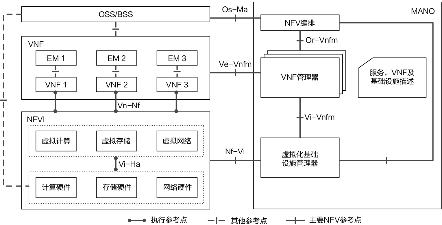 第三部分是MANO。MANO是用于管理各个VNF以及NFVI的统一框架,方便运维人员进行业务编排与设备管理。