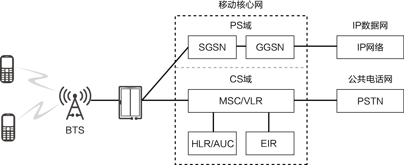 其他相关设备或网络包括BTS、BSC、ISDN、PSTN和PLMN。BTS通过空口传送业务和信令。BSC是BTS的管理者,负责资源分配,建立终端和BTS的连接,一个BSC可以控制一个或多个BTS。ISDN是一个数字电话网络国际标准,是一种典型的CS网络系统。PSTN是一种旧式电话系统。PLMN是由政府所批准的经营者,是以为公众提供陆地移动通信业务为目的而建立和经营的网络。该网络通常与PSTN互联,形成整个地区或国家规模的通信网。