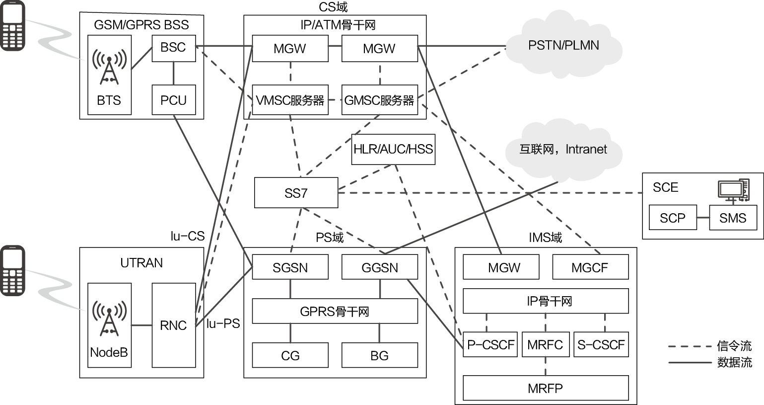 注:BSS为Base Station Subsystem,基站子系统;PCU为Packet Control Unit,分组控制单元;ATM为Asynchronous Transfer Mode,异步传输方式;MGW为Media Gateway,媒体网关;VMSC为Visited Mobile Switching Center,被访移动交换中心;GMSC为Gateway Mobile Switching Center,关口移动交换中心;HSS为Home Subscriber Server,归属用户服务器;SS7为Signaling System Number 7,七号信令系统;UTRAN为Universal Telecommunication Radio Access Network,通用电信无线接入网;RNC为Radio Network Controller,无线网络控制器;CG为Charging Gateway,计费网关;BG为Border Gateway,边界网关;IMS为IP Multimedia Subsystem,IP多媒体子系统;MGCF为Media Gateway Control Function,媒体网关控制功能;P-CSCF为Proxy-CSCF,代理呼叫会话控制功能;MRFC为Media Resource Function Controller,媒体资源功能控制器;S-CSCF为Serving-CSCF,服务呼叫会话控制功能;MRFP为Multimedia Resource Function Processor,多媒体资源功能处理器;SCE为Service Creation Environment,业务生成环境;SCP为Service Control Point,业务控制点;SMS为Short Message Service,短消息业务。