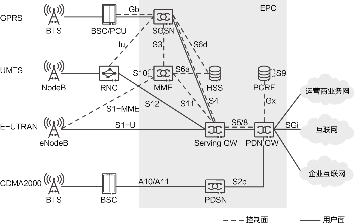 注:EPC为Evolved Packet Core,演进分组核心网;UMTS为Universal Mobile Telecommunications System,通用移动通信系统;MME为Mobility Management Entity,移动性管理实体;PCRF为Policy and Charging Rules Function,策略和计费规则功能;E-UTRAN为Evolved UMTS Terrestrial Radio Access Network,演进型UMTS陆地无线接入网;Serving GW为Serving Gateway,服务网关;PDN GW为Packet Data Network Gateway,分组数据网络网关;PDSN为Packet Data Serving Node,分组数据服务节点。