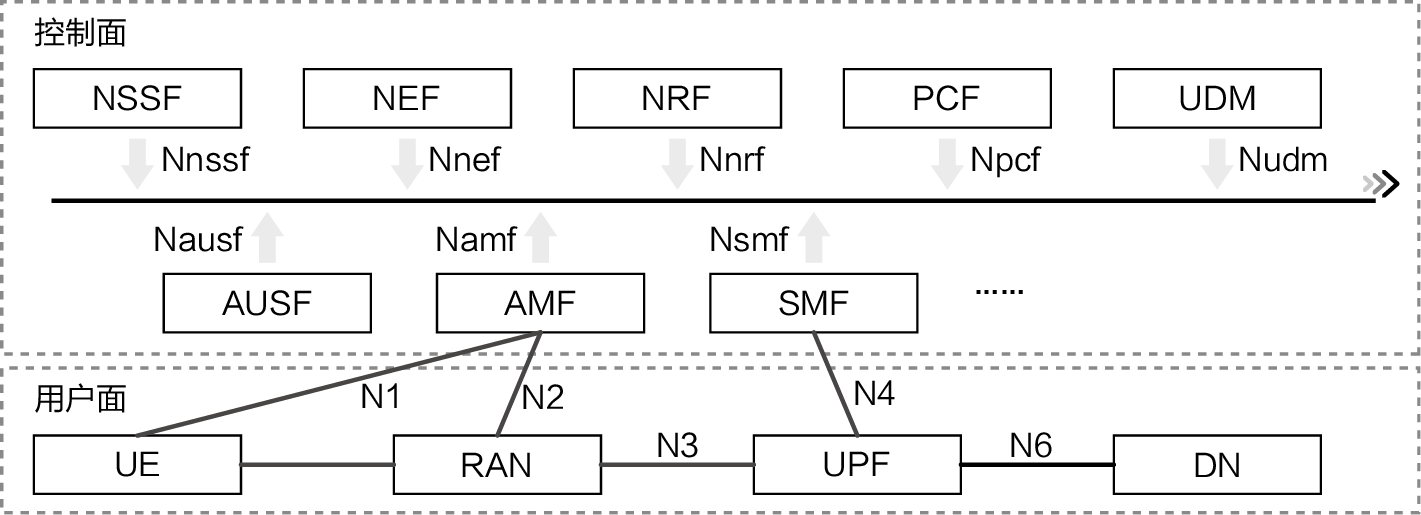 注:NSSF为Network Slice Selection Function,网络切片选择功能;NEF为Network Exposure Function,网络开放功能;NRF为Network Repository Function,网络仓储功能;PCF为Policy Control Function,策略控制功能;UDM为Unified Data Management,统一数据管理;AUSF为Authentication Server Function,认证服务器功能;AMF为Access and Mobility Management Function,接入和移动性管理功能;SMF为Session Manager Function,会话管理功能;UE为User Equipment,用户设备;RAN为Radio Access Network,无线电接入网,业界常称无线接入网;UPF为User Plane Function,用户面功能;DN为Data Network,数据网络。