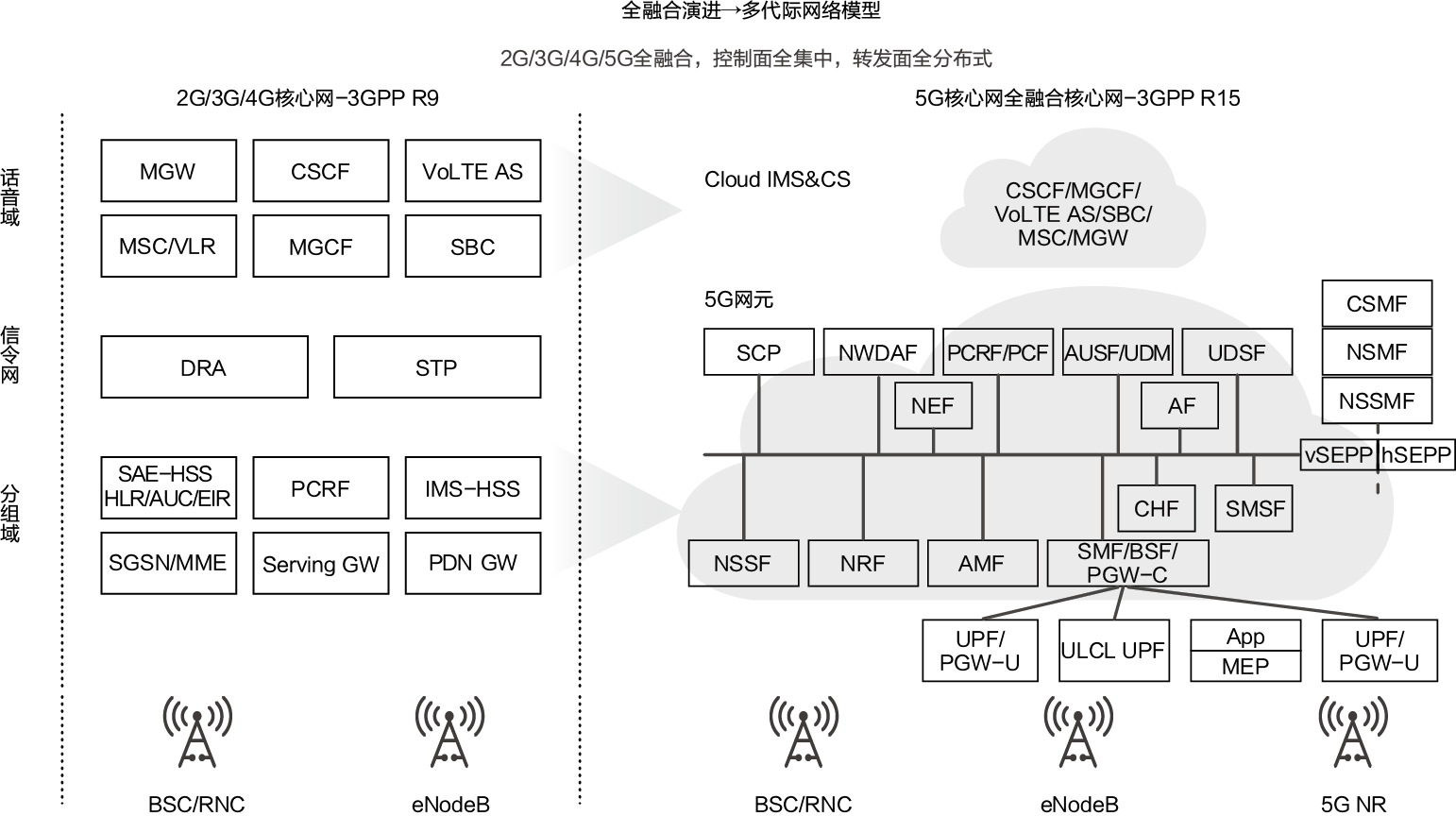 CS域由MSC演进为MSC服务器和MGW的分离结构,同时增加IMS域,增强IP QoS能力,支持端到端的IP多媒体业务。VMSC服务器和GMSC服务器是控制面实体,主要实现MM(Mobility Management,移动性管理)、CM(Call Management,呼叫管理)、MGC(Media Gateway Controller,媒体网关控制器)等功能。MGW是承载面实体,主要实现语音及媒体流的交换,以及提供各种资源,比如编解码器、回波抵消器、放音和收号资源等。