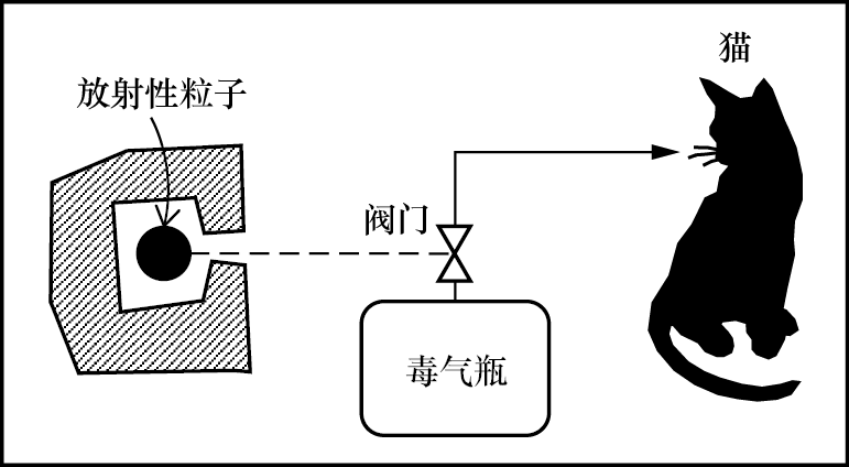 一个黑盒子里装了3件东西:一颗有50%的概率发生衰变的放射性粒子、一台可以被放射性粒子的衰变触发的杀猫装置(例如一个带阀门的毒气瓶,它的阀门会因粒子衰变而打开)和一只不幸被选中的猫,如图1.1所示。