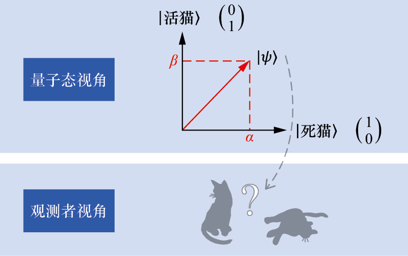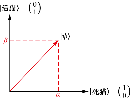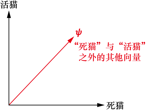 这两个箭头(向量)所表示的就是“死猫”和“活猫”在量子世界中的对应(两种不同的量子态)。同时,“死猫”和“活猫”对应的两个向量正好是相互正交的。