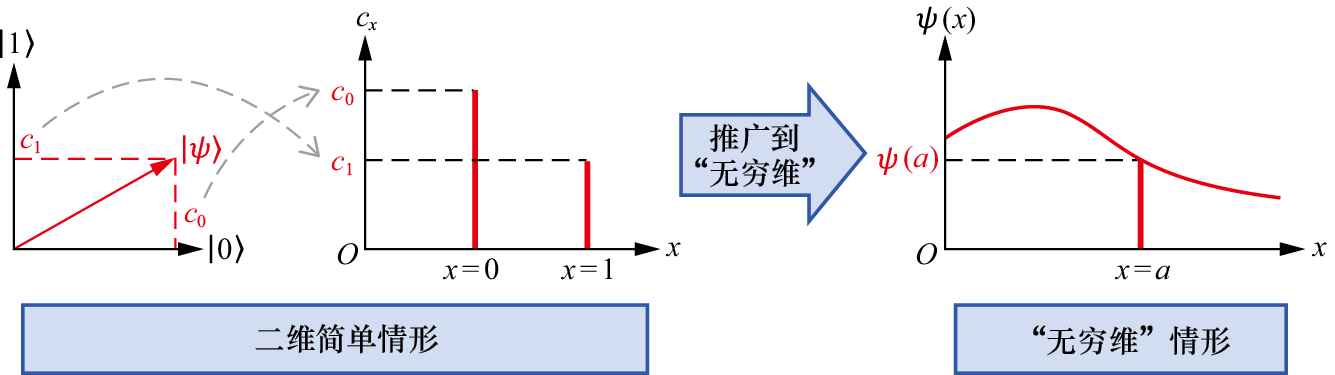 从线性代数中可以知道,两个相互正交的向量可以作为一组正交基底,生成一个二维平面(二维线性空间),这个二维线性空间称作“薛定谔的猫”的态空间(state space)。这个态空间作为一个线性空间,还可能存在其他向量,不妨将其记为