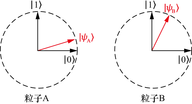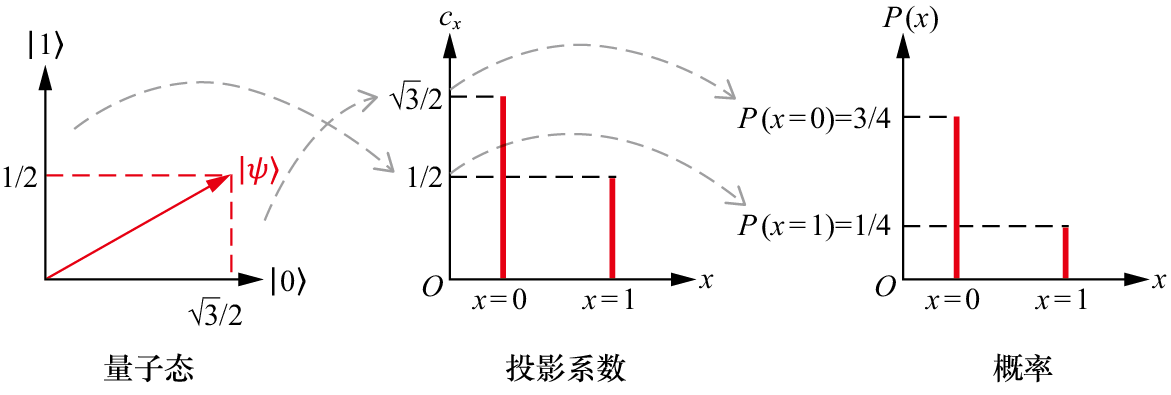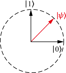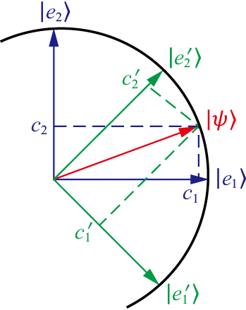 在经典世界里,一只猫的状态要么是生,要么是死,对应到图1.3中,意味着猫的状态只能是那两个正交基底中的一个。但是在量子世界里,猫的状态可以是态空间中任意一个“方向”上的向量。