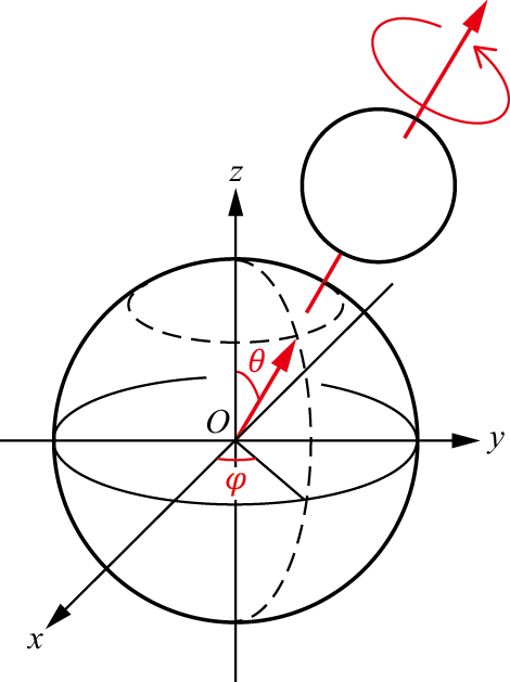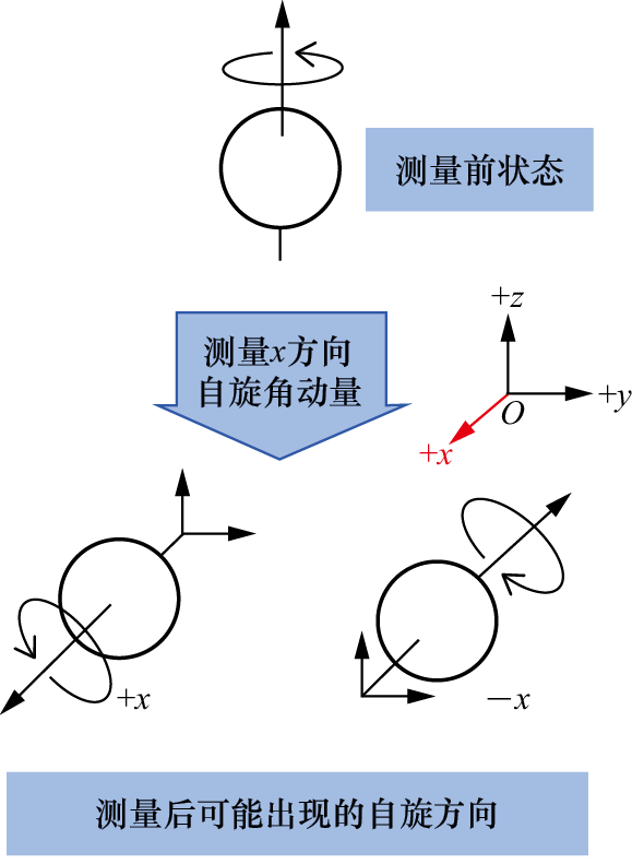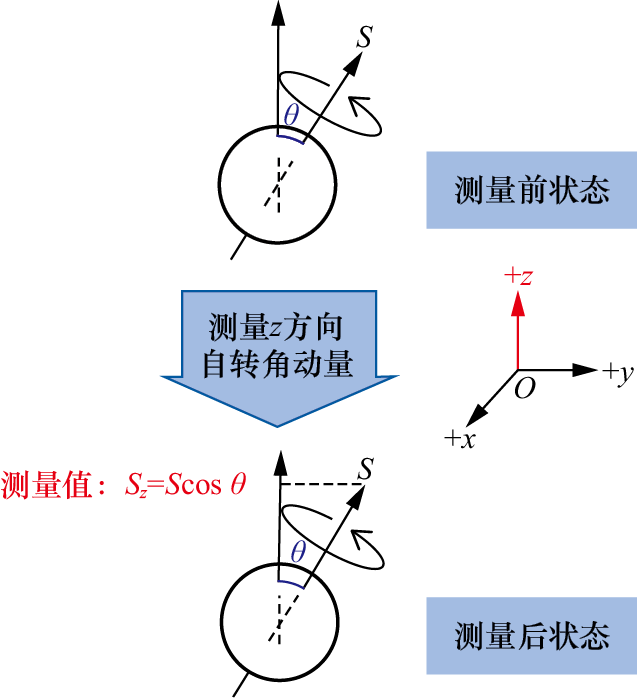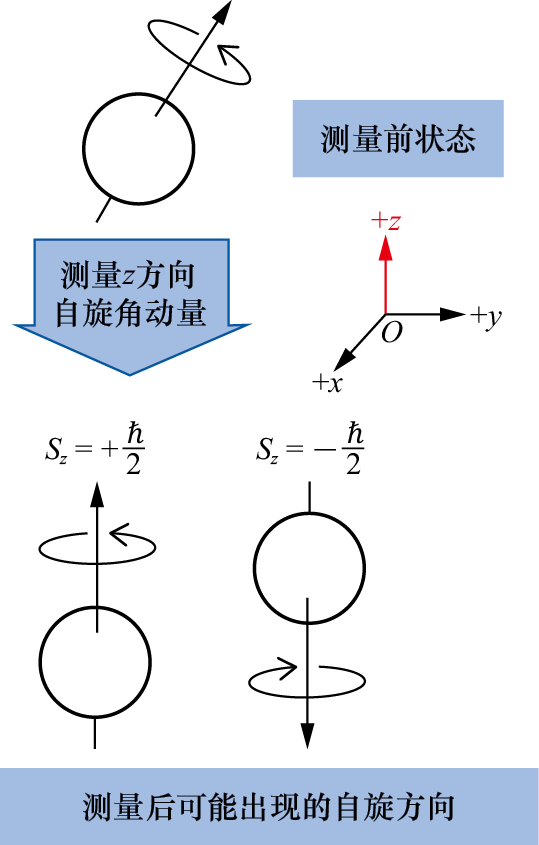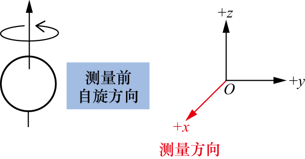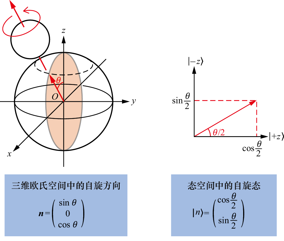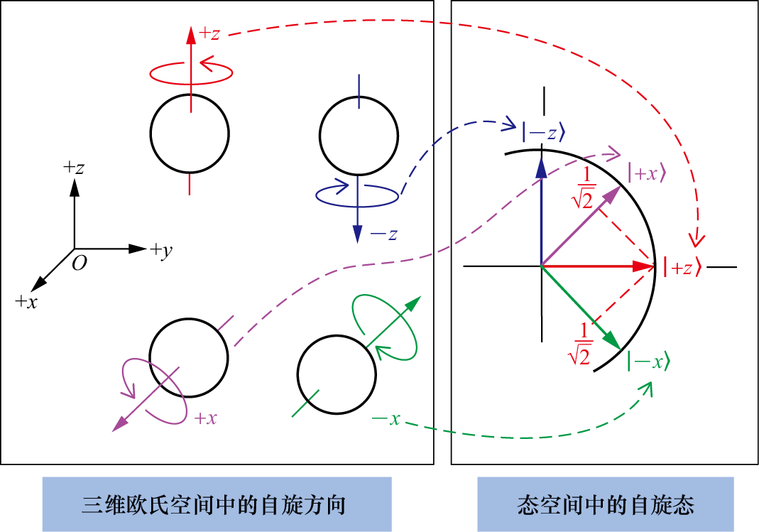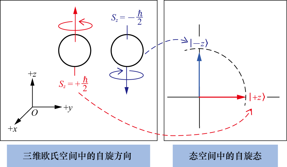 一种典型的方案就是在该方向上加上一个磁场。前面介绍自旋时提到,如果有外加磁场,那么一个粒子的自旋会与磁场相互作用产生能量。而根据薛定谔方程,这个能量将推动自旋态随时间演化。具体地说,就是自旋方向会绕着外界磁场的磁感应强度方向旋转,如图1.35所示。而态空间中相应的自旋态自然也会发生变化(4.5节将给出这个能量以及自旋态时间演化的具体数学形式,并且给出简单的推导过程)。