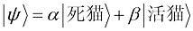 ”这样的形式,即一个竖线加一个尖括号的右半部分,中间夹一个希腊字母、拉丁字母、数字或其他物理量相关符号。为了帮助理解量子态,我们假设“死猫”和“活猫”两个基向量对应的状态为