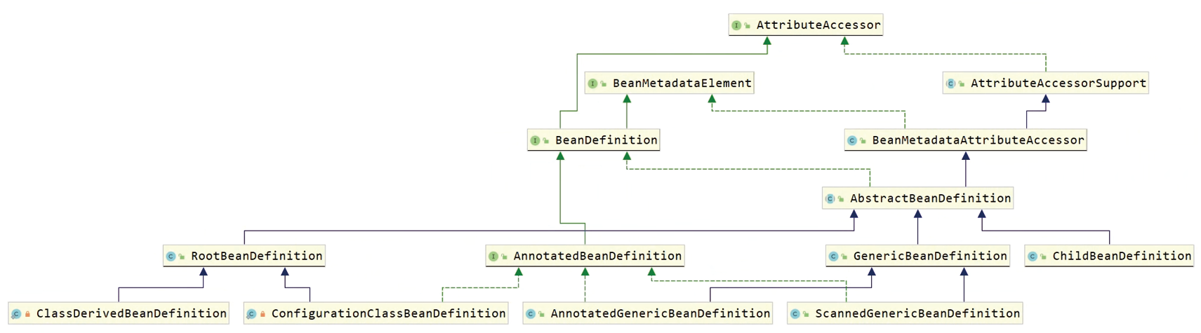 BeanDefinition只是一个描述Bean的信息载体。之所以能从DefaultListable BeanFactory中获取BeanDefinition,是因为DefaultListableBeanFactory除了保存和管理Bean,还要对BeanDefinition进行统一管理,而统一管理的核心来自另一个接口:BeanDefinitionRegistry。