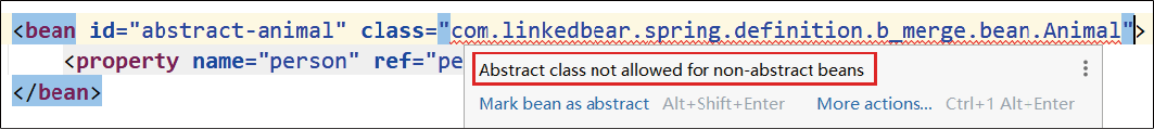 }要想体现出BeanDefinition的合并效果,我们需要使用XML配置文件来注册Bean。注册Person的方式与之前完全一致,但是注册Animal和Cat时需要注意,由于Animal是一个抽象类,而抽象类在XML配置文件中无法直接声明,因此若我们强行编写,IDEA则会给出报错提示(如图1-6所示),程序也无法正确运行。