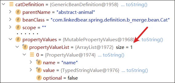 Generic bean with parent 'abstract-animal': class [com.linkedbear.spring.definition. b_merge.bean.Cat]; scope=; ......以Debug的形式重新运行main方法,在获取到的BeanDefinition中我们可以看到,内部的属性赋值信息中只包含name,没有person属性,如图1-7所示,这也证明了刚才我们所说的获取合并信息错误。要想获得合并后的完整BeanDefinition,需要用到BeanFactory的另一个方法:getMergedBeanDefinition。这个方法的名称已经带有“合并”的意思,它来自ConfigurableBeanFactory,用于合并本身的BeanDefinition信息与继承的父BeanDefinition信息然后返回该信息。