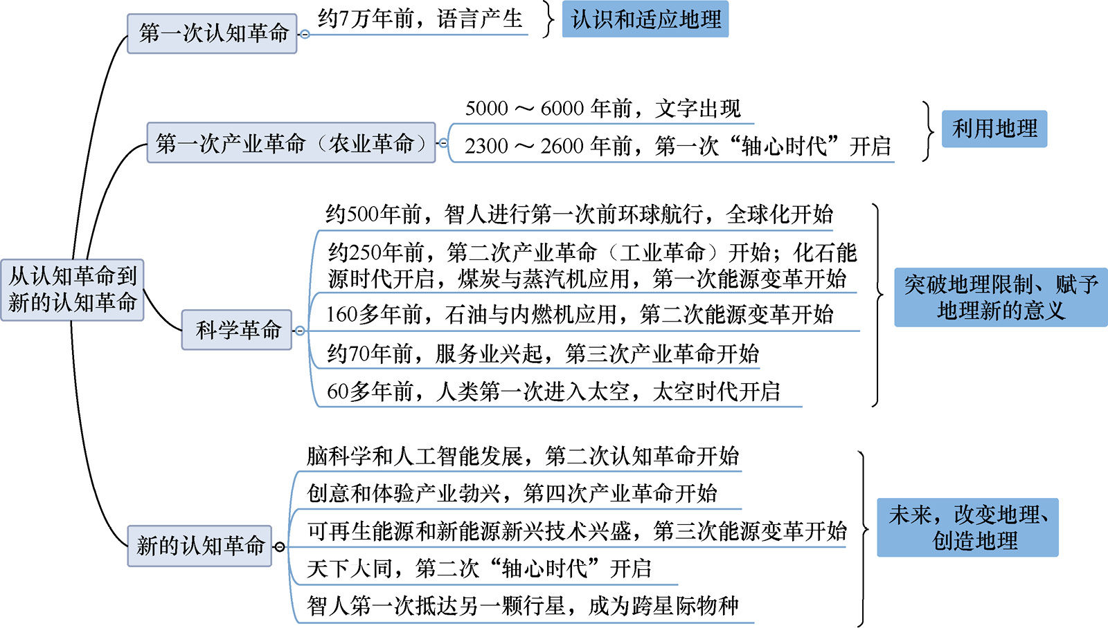 约500年前,科学革命开始。其中,约500年前,智人进行第一次环球航行,全球化开始;约250年前,第二次产业革命(工业革命)开始;化石能源时代开启,煤炭与蒸汽机应用,第一次能源变革开始;160多年前,石油与内燃机应用,第二次能源变革开始;约70年前,服务业兴起,第三次产业革命开始;60多年前,人类第一次进入太空,太空时代开启;“人与地”延展为“人与海”,进一步到“人与天”。这时,智人能够突破地理限制、赋予地理新的意义。