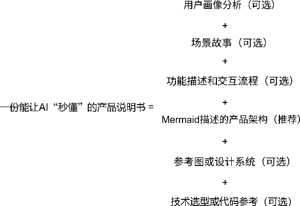 产品说明书的六大模块——用户画像分析、场景故事、功能描述和交互流程、Mermaid描述的产品架构、参考图或设计系统、技术选型或代码参考,本节已逐一讲解如何借助AI快速生成这些内容。完成这些内容正是前言中提到的5项核心能力中的两项的具体落地。