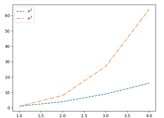 import numpy as np import matplotlib.pyplot as plt x = np.arange(1, 5) y1 = x**2 y2 = x**3 plt.plot(x, y1, '--', label='$x^2$') plt.plot(x, y2, '-.', label='$x^3$') plt.legend() #显示图例