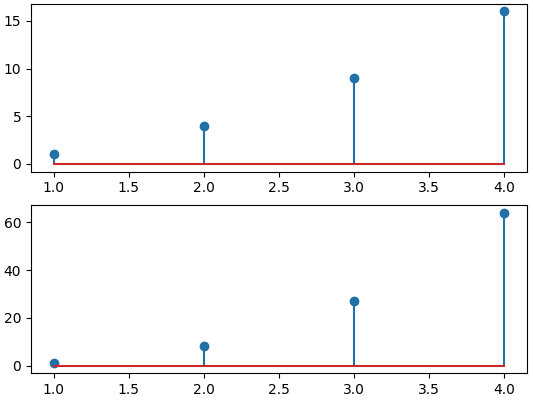 import numpy as np import matplotlib.pyplot as plt x = np.arange(1, 5) y1 = x**2 y2 = x**3 plt.subplot(211) #多幅图形的分布为2行1列,当前为第1幅 plt.stem(x, y1) #绘制垂直线段图 plt.subplot(212) #多幅图形的分布为2行1列,当前为第2幅 plt.stem(x, y2) #绘制垂直线段图