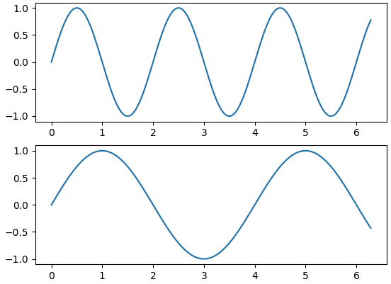 import numpy as np import matplotlib.pyplot as plt t = np.linspace(0, 2*np.pi, 400) s1 = np.sin(2 * np.pi * 0.5 * t) s2 = np.sin(2 * np.pi * 0.25 * t) fig, ax = plt.subplots(2, 1) ax[0].plot(t, s1) ax[1].plot(t, s2)