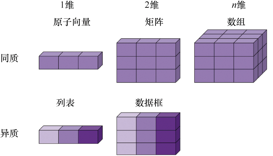 数据结构是指用于存储数据的对象类型。可以根据数据的维度(1维、2维或n维),以及数据是否同质(即是否类型相同)来对R的数据结构进行组织,如图1-1所示。