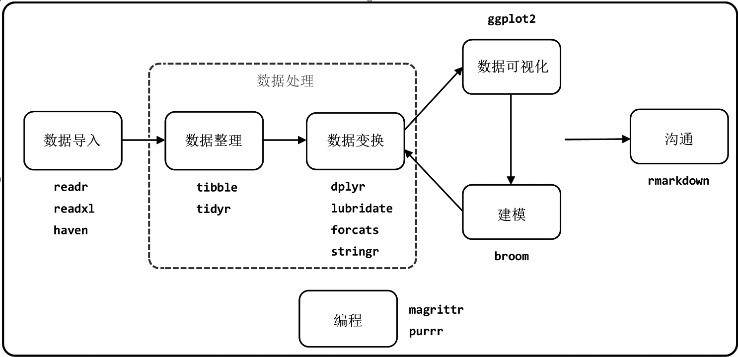 图1展示了一个规范化的数据科学工作流程及其各阶段所涉及的tidyverse包。