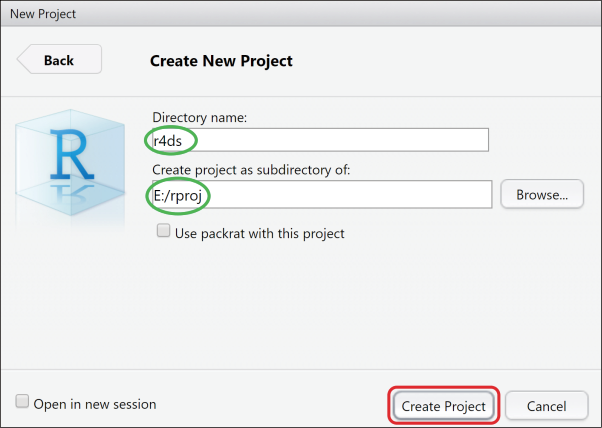 依次单击菜单栏File→New Project→New Directory→New Project,打开New Project对话框。在对话框中填写项目文件夹名称及其所在目录,见图1-6。在单击Create Project按钮后,会打开一个新的RStudio对话框,同时会在E:/rproj下创建一个名为r4ds的文件夹作为项目目录,并在此目录下自动创建一个名为r4ds.Rproj的项目文件。