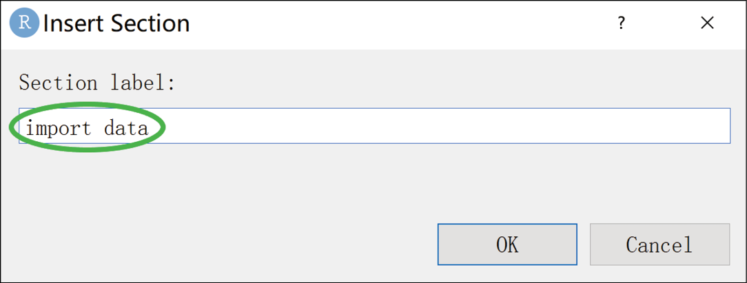 }R中的注释符为#,且只有行注释而没有块注释。每行的注释都应该以注释符(#)和一个空格开始。在R脚本中使用RStudio快捷键Ctrl + Shift + R可以打开插入注释行的窗口(见图1-8),利用注释行可以将大量代码分割成容易理解的代码块。