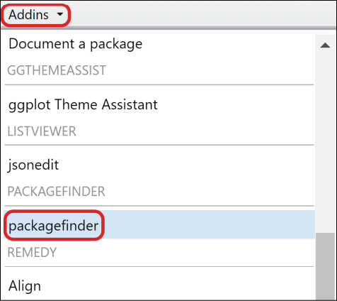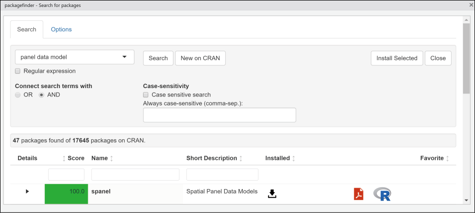 还有一种搜索方法是使用R包packagefinder,它提供了一个RStudio插件(Addins),能够非常方便地搜索发布在CRAN上的R包。安装完packagefinder之后,单击RStudio菜单栏下面的Addins下拉按钮,并选择packagefinder(见图1-9),之后会弹出R包搜索窗口。在下拉文本输入框内输入要搜索的英文关键词(例如,若要学习面板数据模型,可以输入panel data model),单击Search按钮就会在窗口下面显示出相应的R包及其相似性得分等(见图1-10)。