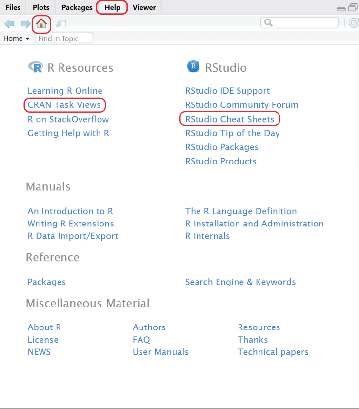 RStudio是非常成熟的IDE,为用户学习R提供了很多帮助,比如打开RStudio界面右侧的Help窗口并单击小房子按钮,会打开有关R的很多帮助资源,其中最有用的是CRAN Task Views和RStudio Cheat Sheets部分,见图1-11。CRAN Task Views页面按照任务将R包进行了分类;而RStudio Cheat Sheets页面提供了Posit公司制作的一些常用包的速查表,这些速查表也可以通过单击菜单栏Help → Cheatsheets来打开。