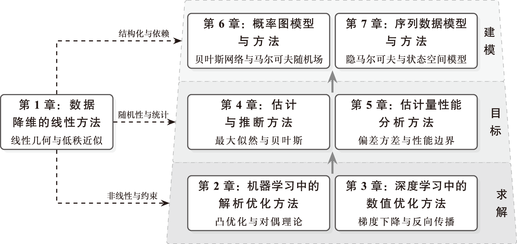 2.体系完整且自洽,紧扣核心技能:内容覆盖数据降维、优化方法、估计与推断、性能分析、概率图模型等核心主题,并在本书附录部分系统补充先修数学知识,确保体系的完整与自洽。